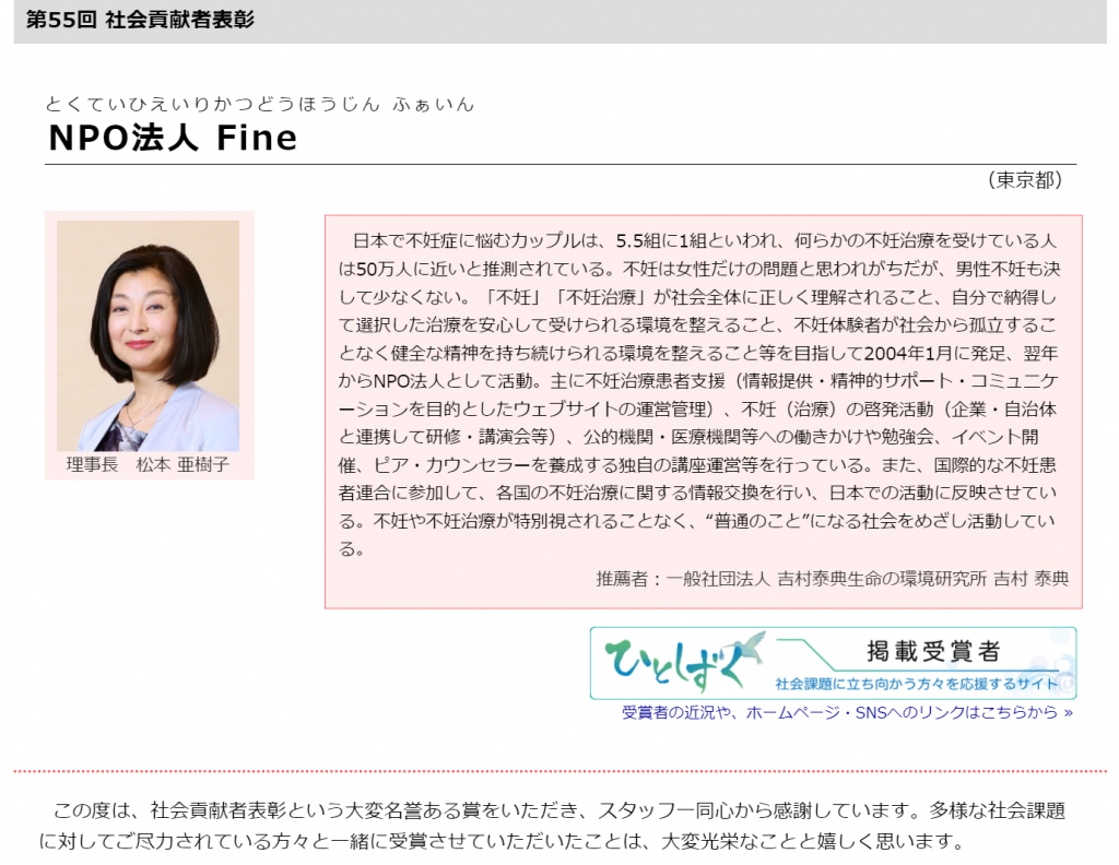 一昨年受賞させていただいた公益財団法人社会貢献支援財団の「第55回社会貢献者表彰」について